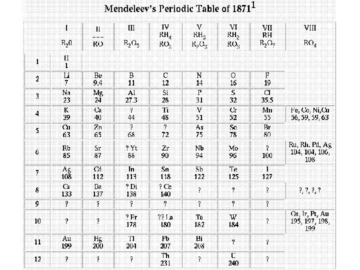 Dmitri Mendeleev (1834 – 1907) – Russian Chemist ØPublished first table that is the basis for today’s periodic table Øarranged elements by increasing atomic mass Øassigned elements with similar properties to the same columns Øpredicted existence of missing elements based on his table Øproblem: some elements did not fit according to their atomic mass and properties I/Te, Co/Ni, Ar/K