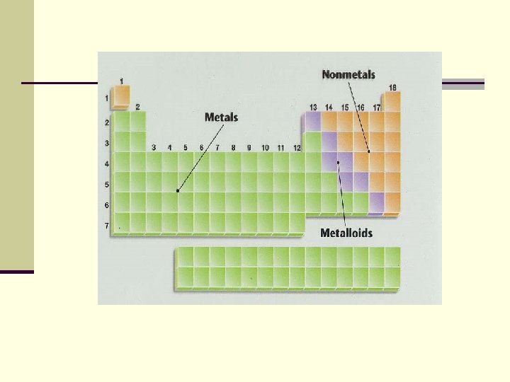 The Current Periodic Table n Now the elements are put in rows by ATOMIC NUMBER!! increasing n The horizontal rows are called periods and are labeled from 1 to 7. n The vertical columns are called groups are labeled from 1 to 18 (and 1 A-8 A).