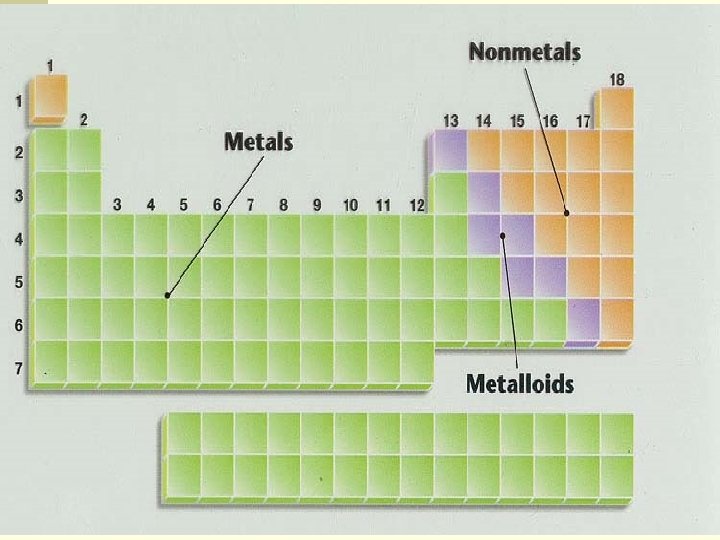 Three Classes of elements n Metalloids n They behave as metals and nonmetals depending on conditions n If boron is added to silicon, then silicon will conduct electricity = semiconductor