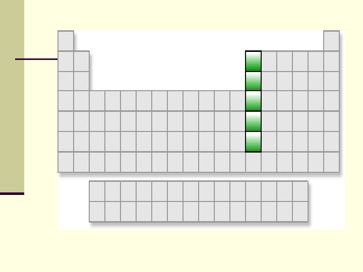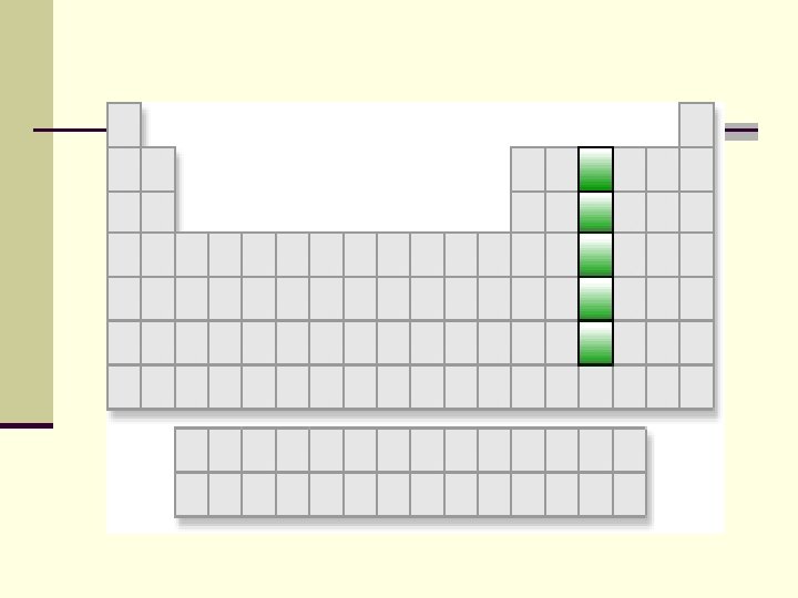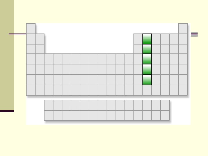 Halogens p 5 (2 p 5 - 6 p 5) n Elements in group 17 (7 A) n Very reactive, volatile, diatomic, nonmetals n Always found combined with other element in nature. n Used as disinfectants and to strengthen teeth.