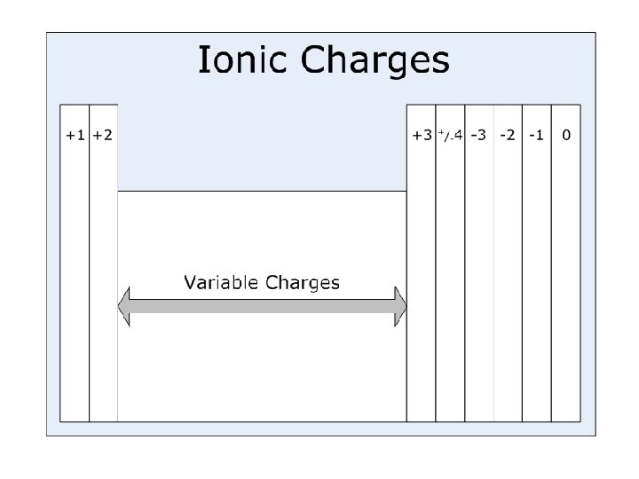 Ion Charge This is the electric charge that an atom has It can be positive or negative, depending on how many electrons it has. An element with a 2+ is missing two electrons An element with a 2 - has an extra two electrons. Some elements have one charge, some have more a multiple ion charge
