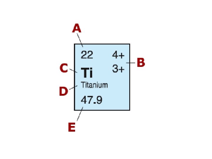 atomic number 22 4+ ion charges(s) 3+ symbol Ti Titanium name 47. 9 atomic mass Each element has its own box in the periodic table!