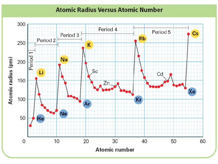 + Page 12 in your notes Lithium 3 P Rings = 2 Protons = 3 Valance e- = 1 Down a Period the number principle energy levels increases, thus increasing the atomic radius. Sodium Rings = 3 Protons = 11 Valance e- = 1 Potassium Rings = 4 Protons = 19 Valance e- = 1 11 P
