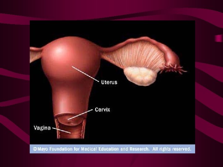 Internal Reproductive Organs cont. . . Uterus (womb): • a hollow, pear-shaped organ that is the home to a developing fetus • it is divided into two parts: • the cervix: the lower part that opens into the vagina; a channel through the cervix allows sperm to enter and menstrual blood to exit. • the corpus : the main body of the uterus, which can easily expand to hold a developing baby