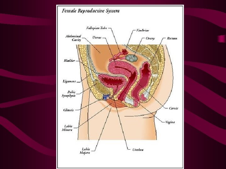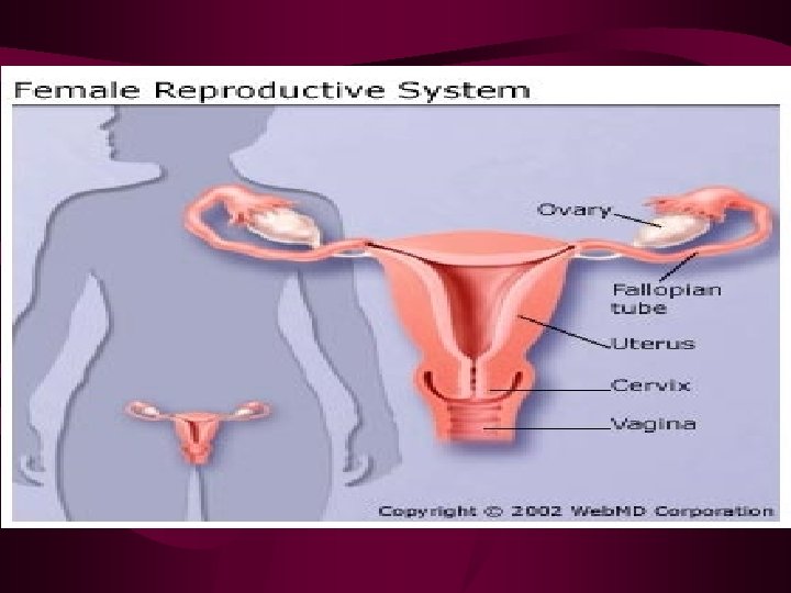 Internal Reproductive Organs cont v At the upper corners of the uterus, the fallopian tubes connect the uterus to the ovaries. v. Ovaries : 2 oval-shaped organs that lie to the upper right and left of the uterus. They produce, store, and release eggs into the fallopian tubes in the process called ovulation. v Each ovary measures about 1 1/2 to 2 inches (4 to 5 centimeters) in a grown woman.