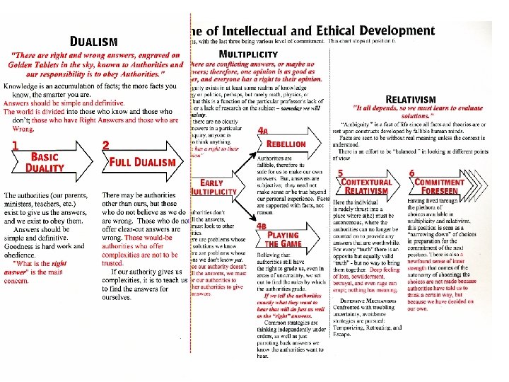 The most difficult, disturbing, destabilizing and dangerous stage for an individual "I prefer the simple world I grew up in. " Retreat "Wait a minute, this is going Temporizing too fast. " "I can’t play this game. . Feels the pull of Escape relativism but does not want to be there.