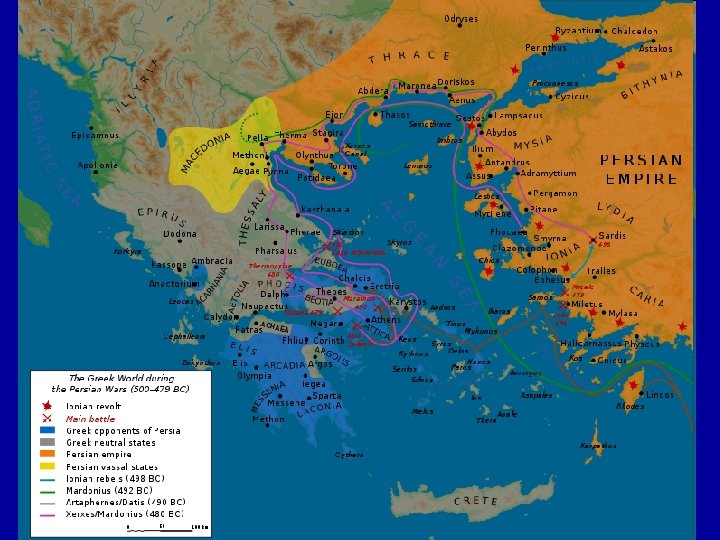 Persian Wars (500 -479 BCE) • Rebellious Greeks in Ionia • Peninsular Greeks join in • Persians defeated at Marathon (490 BCE), retreated, ending the first phase of the Persian Wars • Upon the death of Darius, his son Xerxes I assembled one of the largest militaries ever to invade Greece again in 480 BCE • In 479 BCE at the Battle of Plataea, the Persians were defeated for the final time in Greece. • Further Greek revolts took place of the next 25 years.