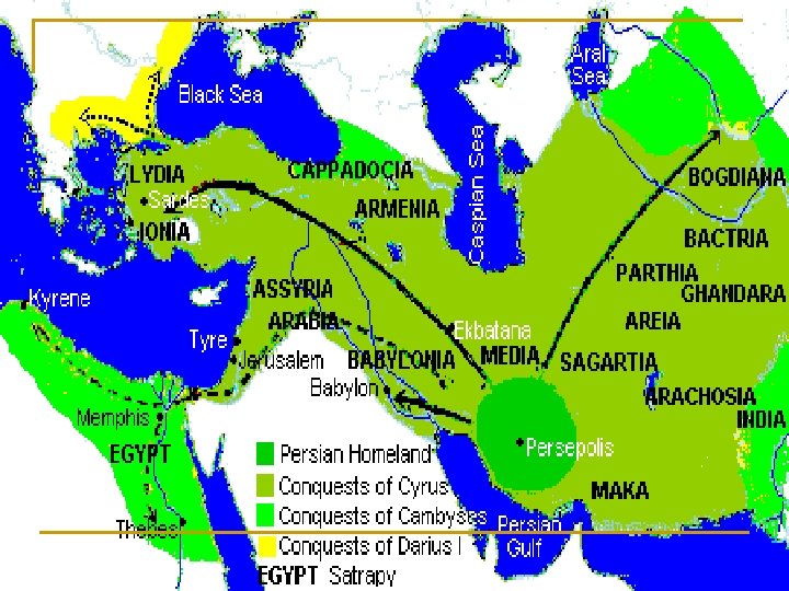 Cambyses and Darius Continued n n 522 B. C, with the help of the Ten Thousand Immortals, Darius seizes control He brought peace to the empire then focused on extending the empire