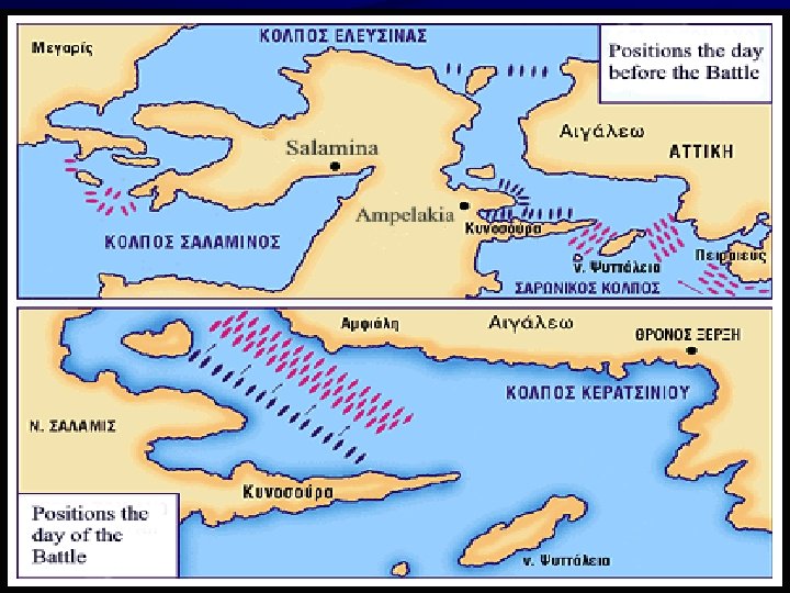 The Battle of Salamis • As their city-state burned the Athenian people and the army escaped to the island of Salamis • The Persians were quick to follow the retreating Greeks to Salamis