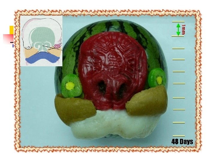 Development of face: 1 st pharyngeal arch 4 -8 wks, human appearance 5 facial primordia臉原基 single frontonasal prominence (FNP) forehead rostral boundary of the stomodeum, primordial mouth, nose paired maxillary prominences upper cheek & most of the upper lip paired mandibular prominences chin, lower lip, lower cheek