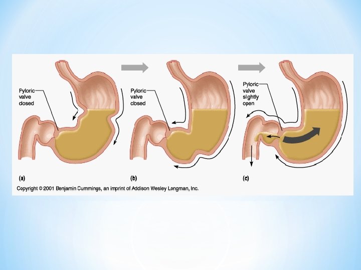 *Swallowed food comes into contact with acidic gastric juice *Gastric juice= hydrochloric acid (p. H 1 -2) + enzyme pepsin (breaks down proteins) *Mucus lining protects stomach from acid *Muscles of the stomach wall move food to increase the contact between the food and the gastric juice *Becomes chyme- liquefied food *Stomach pushes chyme through the pyloric sphincter into the small intestine