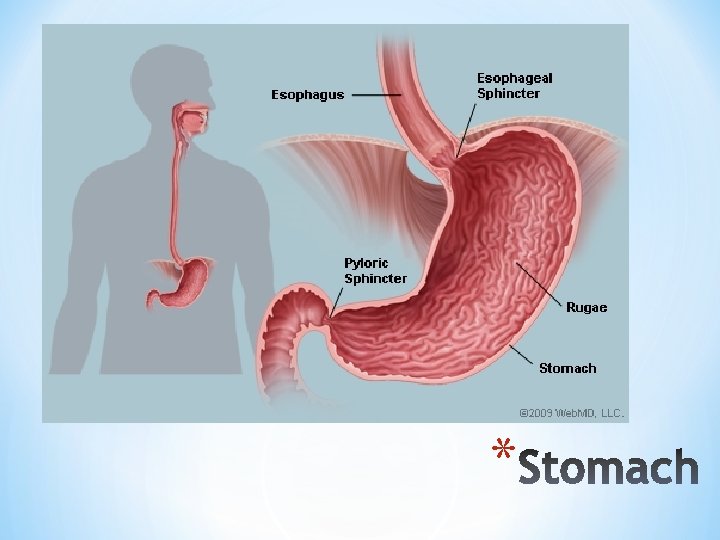 *Hollow muscular organ left side of upper abdomen *receives food from the esophagus via a muscular valve called the lower esophageal sphincter *Ridges in muscle tissue called rugae- allow expansion Rugae of Stomach *pyloric sphincter opens to allow food to pass from the stomach to the small intestine