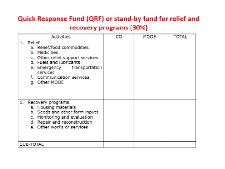 Sec 21 of RA 10121 • Local Disaster Risk Reduction and Management Fund (LDRRMF). Not less than five percent (5%) of IRA and estimated revenue from regular sources shall be set aside as the LDRRMF q 70% will be used to support disaster risk management activities such as, but not limited to, pre-disaster preparedness programs including training, purchasing lifesaving rescue equipment, supplies and medicines, for postdisaster activities, and for the payment of premiums on calamity insurance q 30% shall be allocated as Quick Response Fund (QRF) or stand-by fund for relief and recovery programs