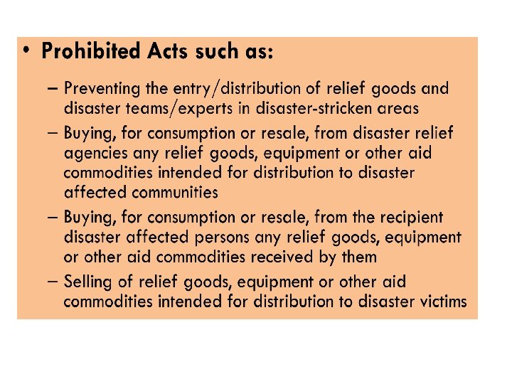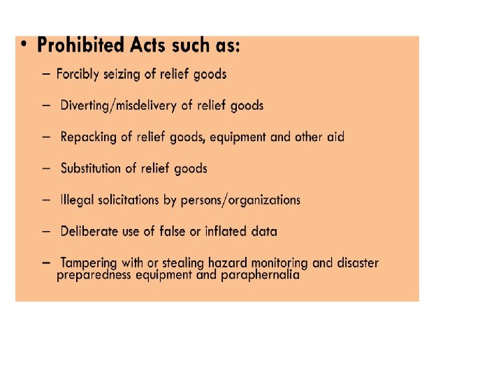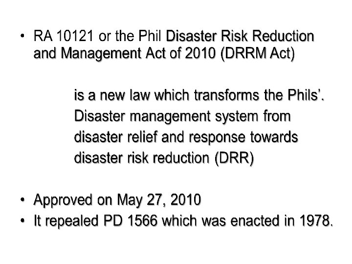 Why do we need to have a new law? PD 1566 RA 10121 • Assumes that disasters cannot be avoided • Most plans were on the provision of relief goods & infra like dike & flood control systems (reactive) • Government response was focused on disaster response • Transforms & reforms the way we deal with disasters q that impact of disasters can be reduced by addressing the root cause of disaster risks q from disaster response to risk reduction q emphasis on strengthening peoples’ capacity to absorb stress q Proactive and developmental approach in managing disaster Ability to anticipate, respond to and recover from. . ,
