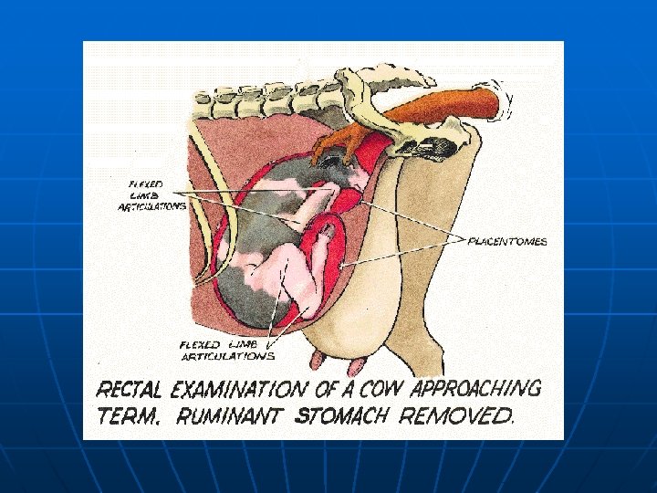 Vaginal Examination • Pre-calving • Post calving • Before rectal examination • Wash • Note for any evidence of: – Tears – vaginal & cervical – Retained fetal membranes – Metritis