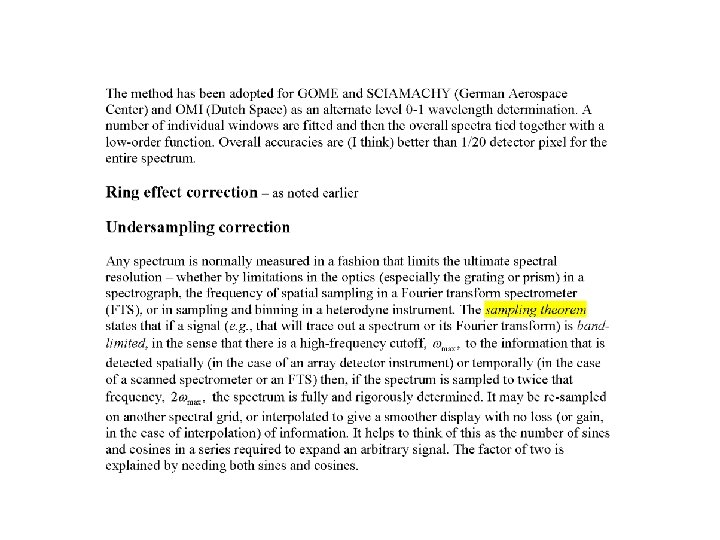 Sampling Contributions to Instrument Line Shape (Slit Function) The fully (Nyquist) sampled part is where and max is the spatial sampling on the detector. m runs over the detector pixels. The undersampled part is Chance, K. , T. P. Kurosu, and C. E. Sioris, Undersampling correction for array-detector based satellite spectrometers, Applied Optics 44, 1296 -1304, 2005.