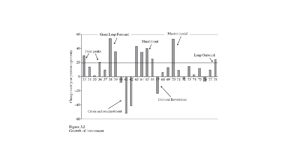 Policy Instability • • • Economic recovery 1949 -1952 The twin-peaks of the first five-year plan 1953 and 1956 Retrenchment: The “Hundred Flowers” of 1956 -1957 The Great Leap Forward 1958 -1960 Retrenchment: Crisis and Readjustment 1961 -1963 Launch of the “Third Front” 1964 -1966 Retrenchment: The Cultural Revolution 1967 -1969 Preparation for war 1970 Retrenchment: Consolidation and drift 1972 -1976 The leap outward and the end of Maoism 1977 -1978 A final turning point: The Third Plenum of 11 th CCP Central Committee, Dec 1978
