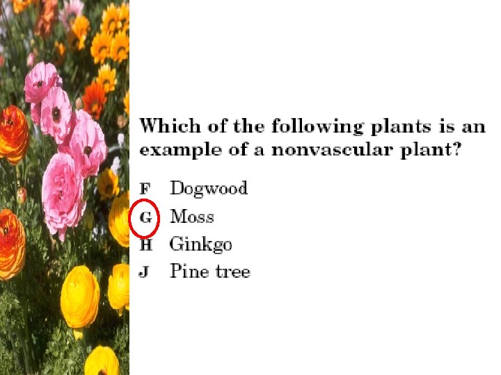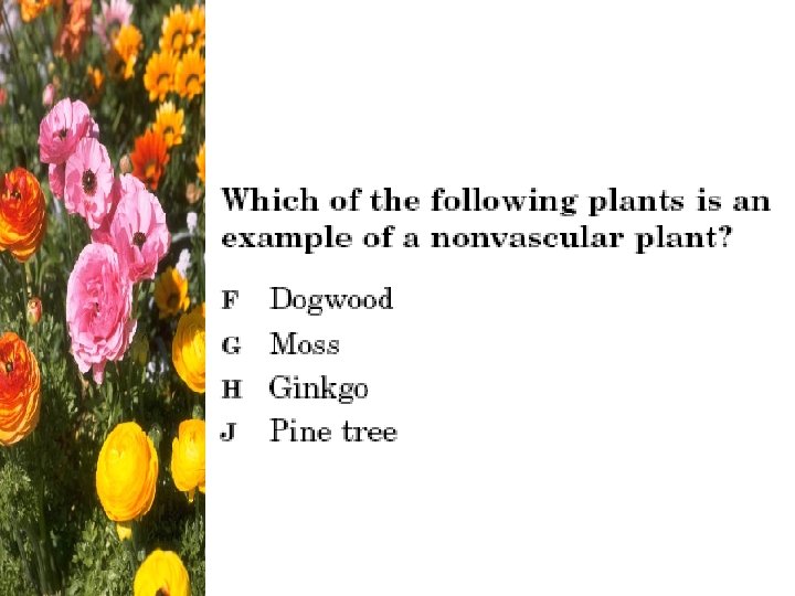 Plant Classification • Plants evolved from green algae (protists) • They are first classified as – Nonvascular – short plants with no transport tissue (like veins), e. g. moss – Vascular – taller plants with veins, e. g. trees • Xylem – veins for water • Phloem – veins for food