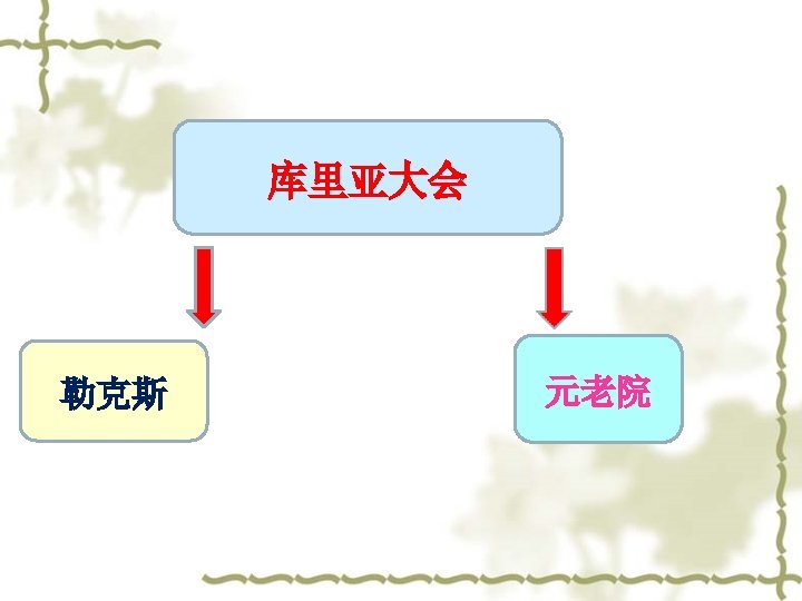 (3)元老院 Curia v v 300名氏族贵族组成 第一,有权讨论并提出 新的法律,交由库里亚 大会通过 ; 第二,媾和权; 第三,处理罗马的公共 事务 v v 300 aristocrats The power to discuss and propose the law The power to make peace Deal with the public affairs