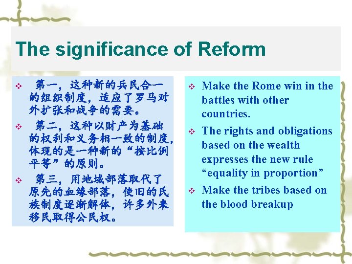 3. Reform of Servius Tullius (578 BC— 534 BC) v v 1、进行财产普查和划分财 产等级。 2、按照财产等级规定兵役 义务。 3、创立“森都里亚”大会 为新的民众大会,贵族平民 均可以参加。 4、打破原氏族制度的限制。 v v Carry out the general survey of wealth and divide the wealthy class Regulate the military service based on the wealthy class Set up new Centuria Break the limit of the original tribe system