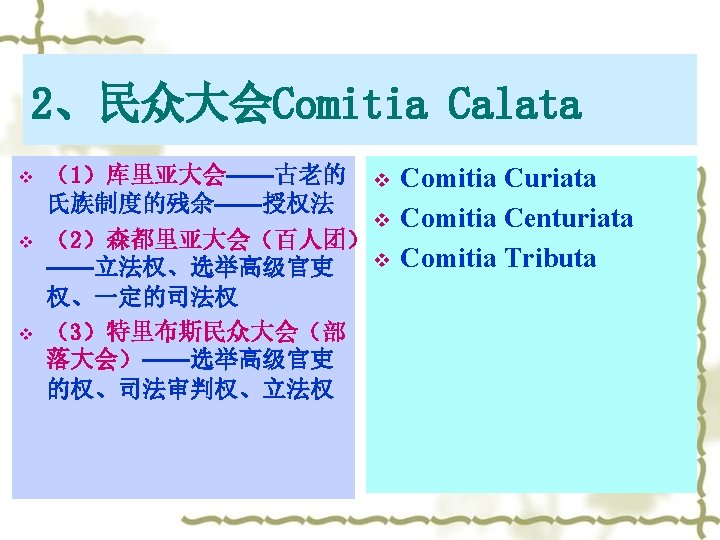 (2)Comitia curiata v v v 最高权力机关 第一,有权通过和否决 一切法律; 第二,有权选举一切高 级公职人员,选举勒克 斯; 第三,宣战权; 第四,最高审判权 v v v Supreme Power Organ The power to pass and veto every law The power to elect the higher office and king The power to declare the war The highest judicial power