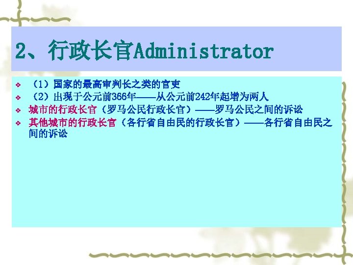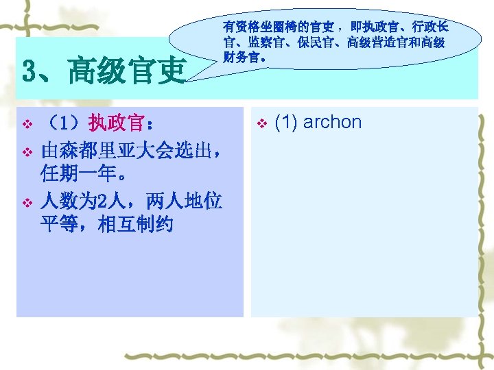 Archon’s Powers v v v A、军事统帅权 B、有权召集元老院会议 和民众大会,并担任主席 C、是元老院和民众大会 决议的执行者 D、有权向元老院和民众 大会提出建议和提案 E、一定的司法审判权 v v Power of military commander-in-chief Power to convene the Comitia Centuriata and Council Senator Power to propose Judicial power