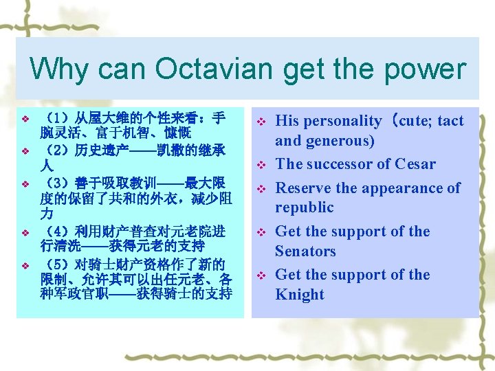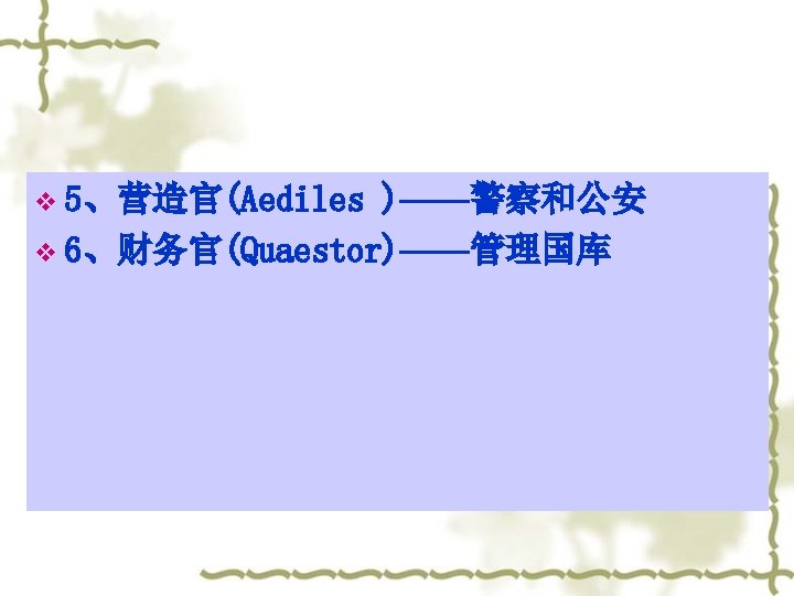 The powers of senatus v v v v A、立法:对罗马的立法具 有决定性权力 B、人事任命权 C、最高行政权力——管理 国家的财政和国库 D、军事上的最高领导权力 E、外交权 F、宗教权——对祭祀的最 高监督权 G、最高司法权 v v v v Legislation Power of appointment Supreme Power of Administration Military power Power of Diplomacy Religious Power Supreme Judicial Power