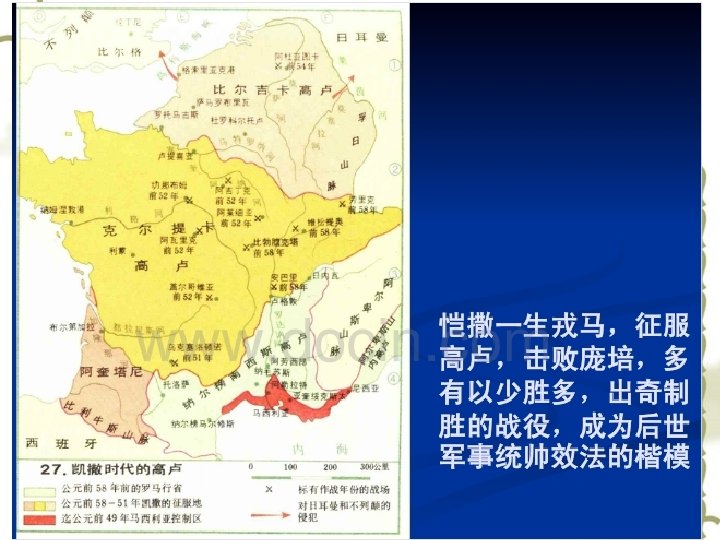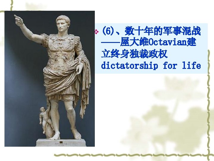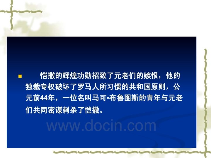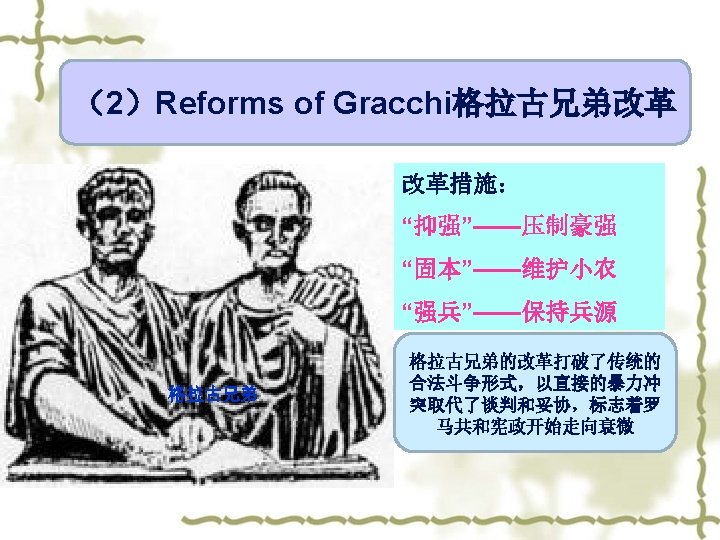 (4)Intensification of Class contradictions v v v A. 奴隶的大规模起义(公元前138 —前132年和公元前104—前101 年的两次西西里奴隶起义和公元 前73—前71年斯巴达克起义) B. 被征服地区的人民对罗马统治 的反抗和暴乱(公元前91年—— 88年意大利人的同盟战争) C. 罗马平民、无产者与罗马统治 者的矛盾使共和国长期陷于危机 之中 v v v The large-scale revolt of slave The rebellion from the citizens in the conquered area to the Rome The class contradictions between the Plebs, proletarian and ruler
