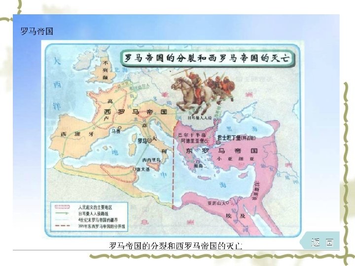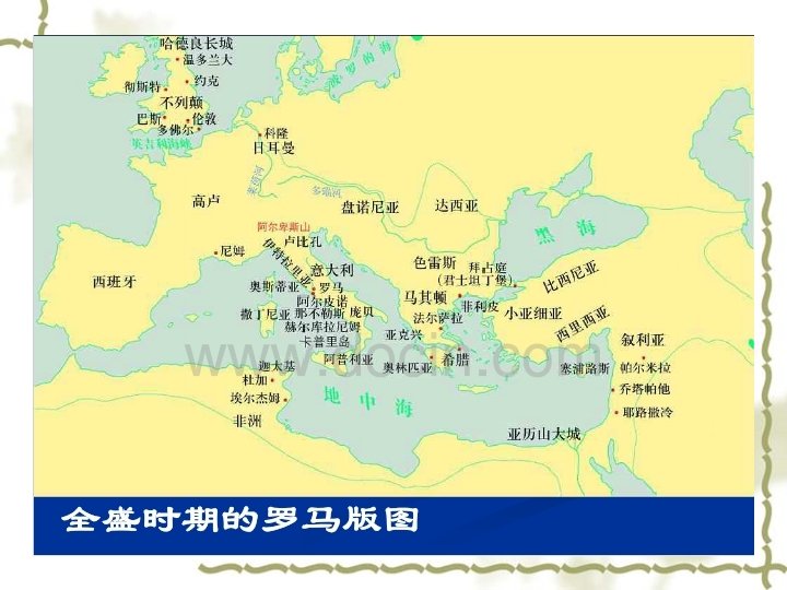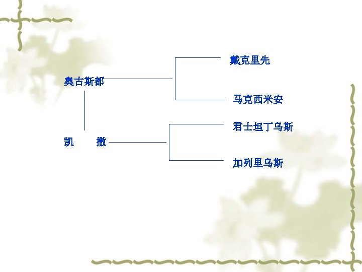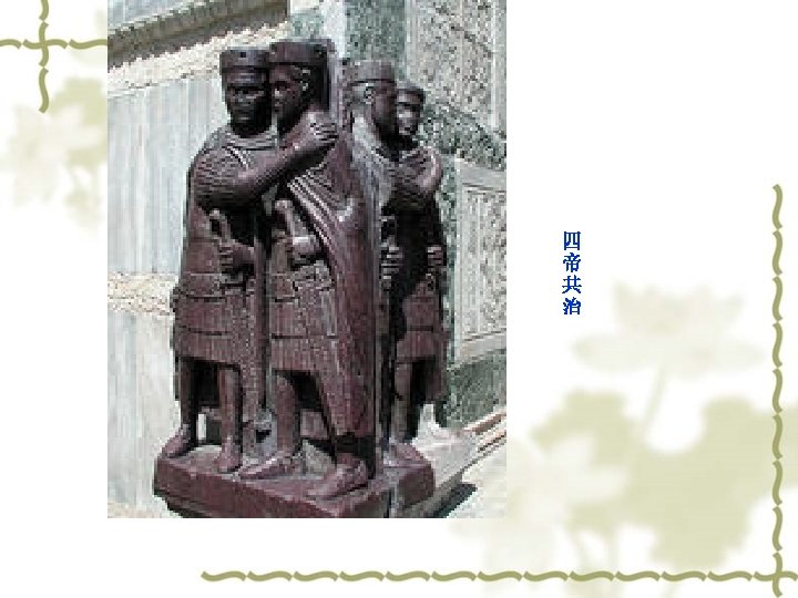 C. Diocletianus Reform v v v (1)军事改革 (2)划分东西罗马——四 帝共治模式 (3)重划行省和行政区 (4)建立帝国官僚体制 (5)建立专制司法体制 (6)强化希腊——罗马传 统宗教信仰 v v v Military reform Divide the Rome into TWO PARTS Reorganize the province Set up the bureaucracy system Set up the judicial system Strengthen the Greece. Rome religious