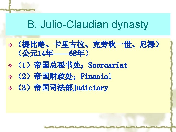 3. Political System of Dominatus Era v v A. 社会历史原因 (1)元首制的统治并没有能彻 底解决奴隶制度的矛盾 (2)新型的小农经济发展起来。 (3)罗马内部阶级斗争空前激 烈——军队扩张到空前的规模— —许多军事巨头形成——罗马统 治阶级内部争夺权力的内战 v v v The System of Augustus Principate could not deal with the social contradiction. New types of small farmer’s economy had developed. Fight for the powers inner the circle of rulers were fierce.