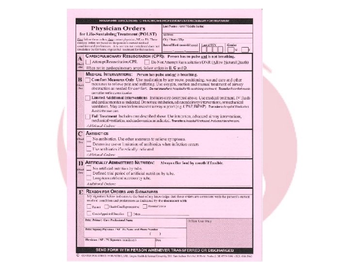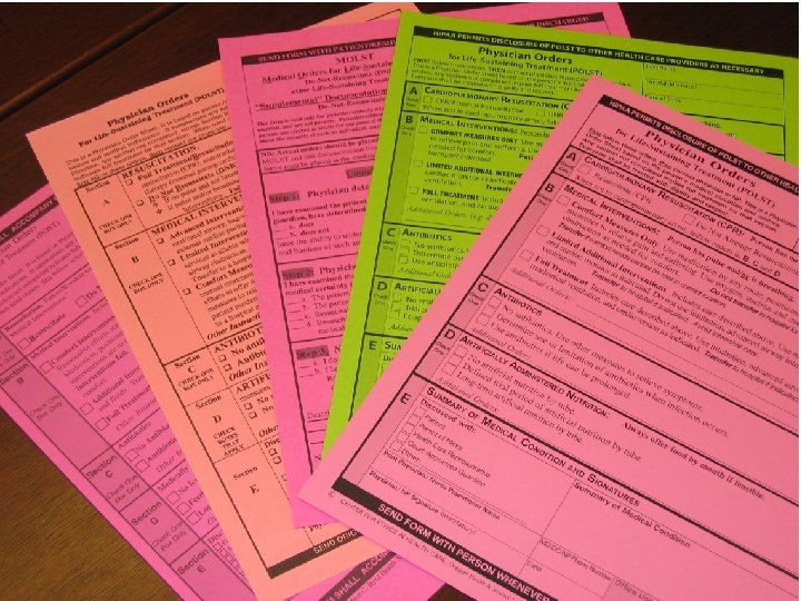 Definitions • Advance directives – Directive to physicians/living will – Power of attorney for health care • Do not attempt resuscitation-DNAR • POLST and POLST paradigm (In some states called