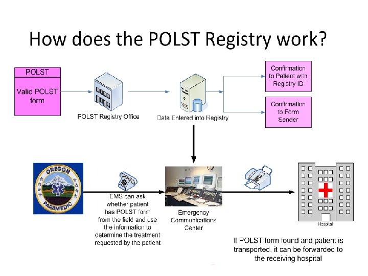 What is it? • Secure electronic registry of POLST orders. • Located at the Emergency Communication Center at OHSU and protected by the OHSU firewall • Allows health care professionals access to POLST orders if the original POLST form cannot be immediately located.