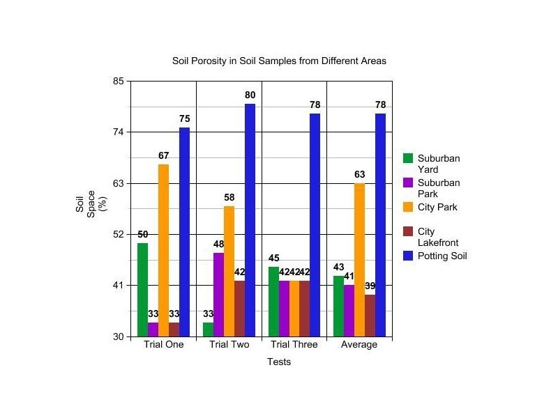 Hypothesis Given that most soils are composed of mineral types, like sand, silt or clay, and organic matter, the pore space is determined by knowing the soil type and the percentage of sand, clay and silt within the soil. It is important to also remember that as the soil particle size increases, the pore size also increases. The opposite situation also occurs. Given all of these factors, the experimenter believes that the soil sample size from the suburban yard will displace the most water because the suburban yard must absorb a lot of water from rainfall, melting of snow/ice, watering vegetation, water runoff, etc. The experimenter believes that the suburban park and city park will be next in absorbing the most water because the parks should contain similar amounts of mineral given that they are both used in parks. Since parks also have areas that are designed for different fields to play sports, the compositions of the soil are a little more versatile in mineral compositions, which means it will not absorb as much water, but keep it on top of the soil to be evaporated into the atmosphere to keep those fields dryer. Finally, the city lakefront will absorb the least amount of water because the amount of water it is exposed to yields a soil that must allow most of the water to run-off back into the lake.