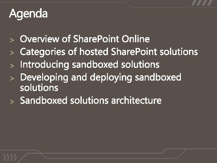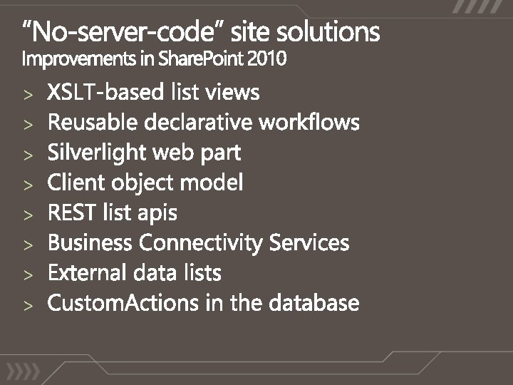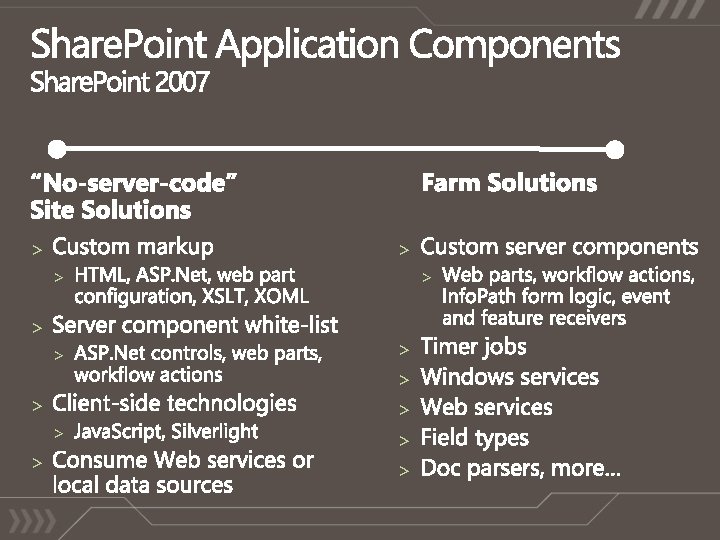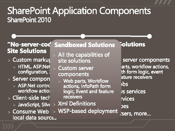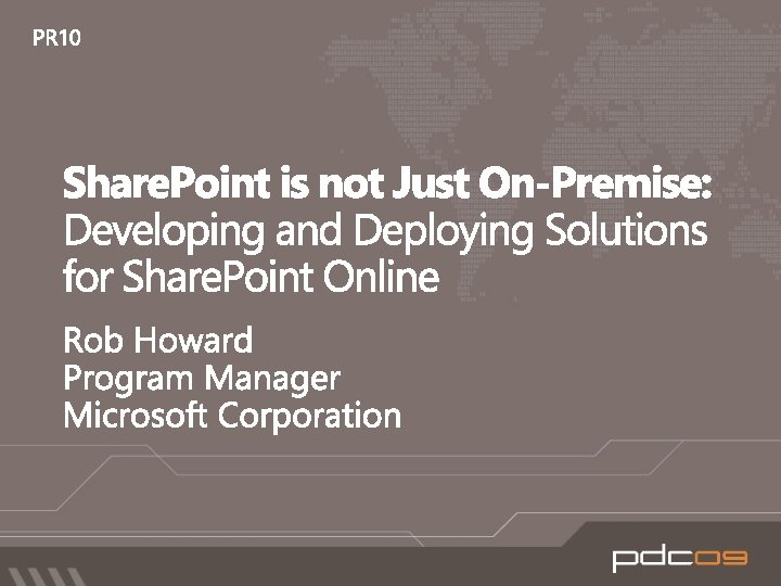 The Power of Choice! On-Premises Deployments Self-hosted and managed Direct access to physical machines Central admin access Hosted within own data centers Entire environment customizable All accounts, machines, and data within a single AD Forest Available to companies of any size. Share. Point Online Standard Multi-tenant hosting Shared Hardware Outsourced IT management Hosted within MS data centers No support for “farm” code Support for Share. Point Designer based customizations Certificate authentication (today) or Forms based authentication (2010) Available for companies with 5+ seats Share. Point Online Dedicated Hosting Dedicated Hardware Outsourced IT management Hosted within MS data centers Most of the environment is customizable (“farm” code is supported) Machine and Process accounts in a different AD Forest NTLM Authentication Available for companies with 5000+ seats
