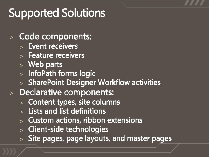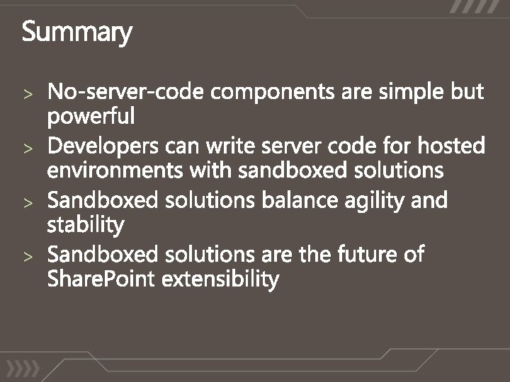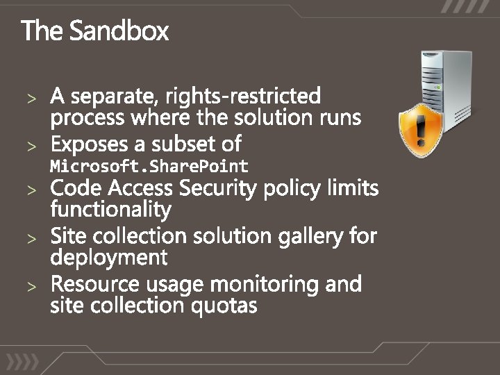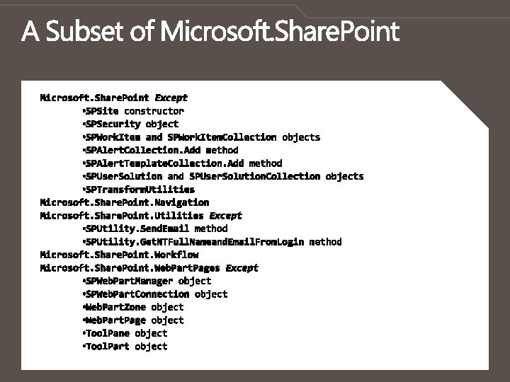 No timer jobs No web service calls No elevation/impersonation Note: A fully-trusted “proxy class” can be created to gain access to additional resources