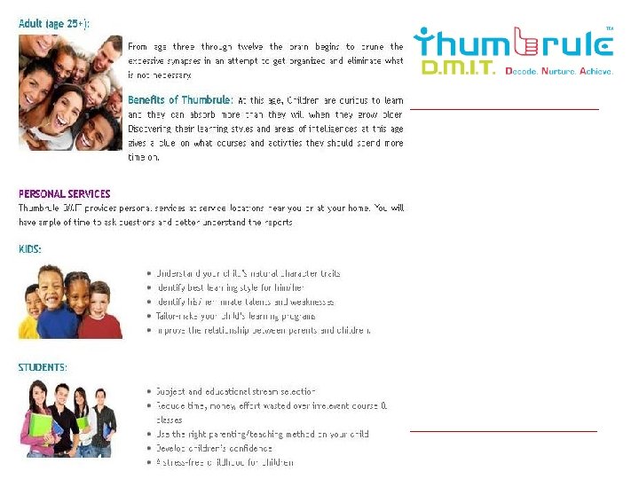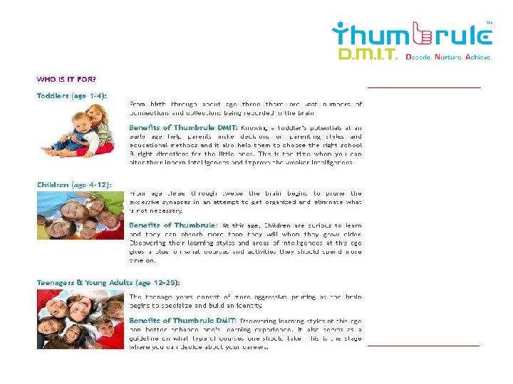 About Us o Thumbrule Nepal is the 1 st company to introduce in Nepal the world renowned concept of MI & “Multiple Intelligence Testing” (MIT) o The results will be derived from a scientifically proven technique – Dermatoglyphics o Dermatoglyphics has been used in diverse fields like medicine, genetics, psychology, education, recruitment o MI Theory was propounded by Prof Howard Gardner of Harvard University in 1983