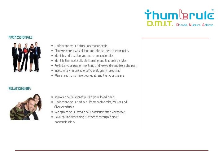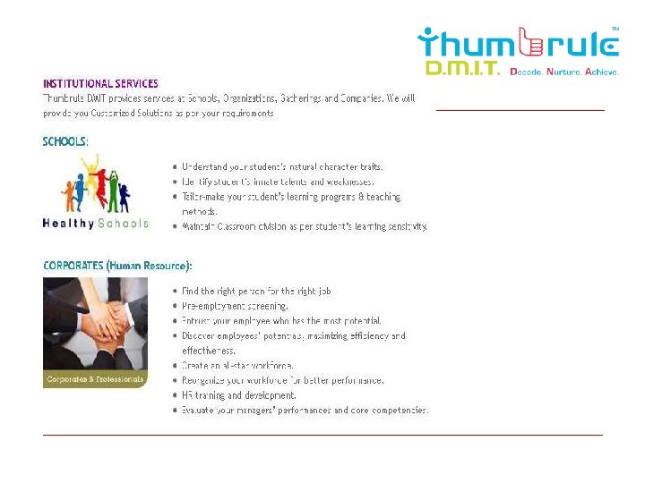 Need of DMIT for Corporates? o Create an all-star workforce o Reorganize your workforce for better performance o HR training and development o Evaluate your managers’ performances and core competencies