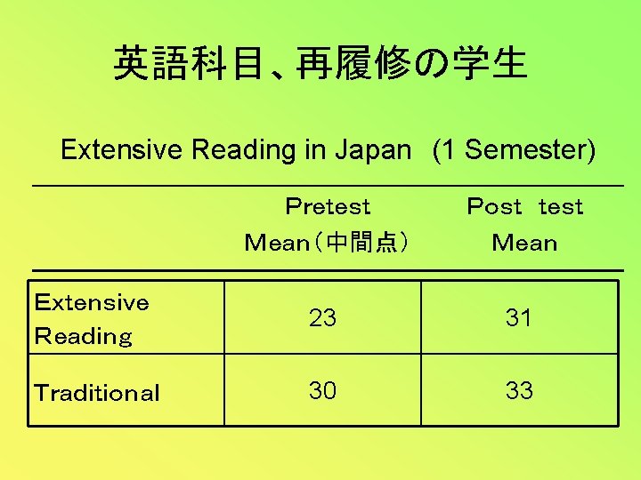 Singapore Results 英語習得 • 3 studies of 3, 000 children aged 6 -9 • The children participated in a “Reading and English Acquisition Program” • The children who read English for fun learned English better than those who studied in the traditional way.