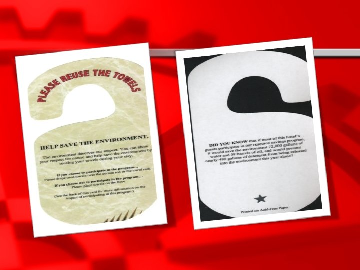 Percentage of towel reuse. 55% 52. 5% 50% 47. 5% 42. 5% 40% 37. 5% 32. 5% Environmental Focus Reciprocation Focus (1) Reciprocation Focus (2) Descriptive Social Norm Focus (1) Descriptive Social Norm Focus (2)