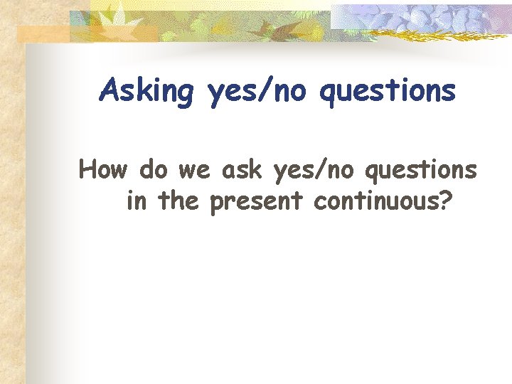 Asking yes/no questions How do we ask yes/no questions in the present continuous?