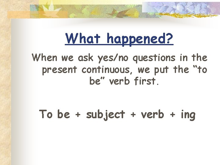 What happened? When we ask yes/no questions in the present continuous, we put the “to be” verb first. To be + subject + verb + ing