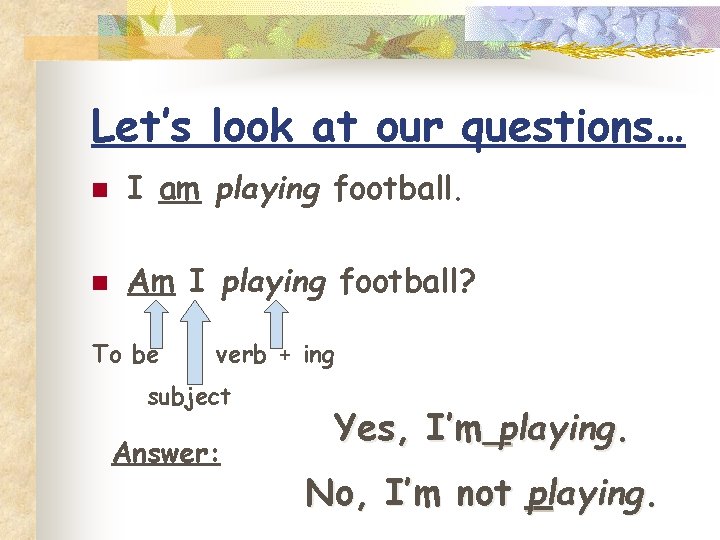 Let’s look at our questions… n I am playing football. n Am I playing football? To be verb + ing subject Answer: Yes, I’m playing. No, I’m not playing.