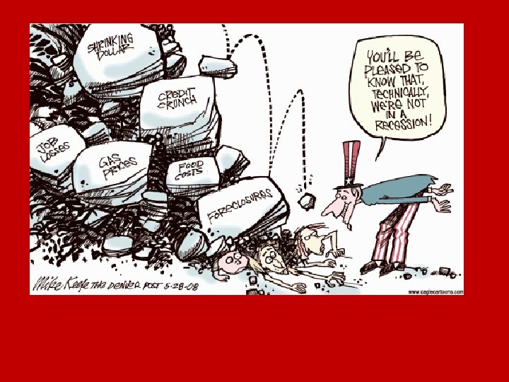 The “Great Recession” of 2008 • Causes- Over speculation in the housing market, risky lending practices at major banks, heavy federal debt, and unbalanced trade with foreign countries. • Effects- High unemployment (around 12%), greater demand for federal assistance, lower incomes, lower stock values, lower home values, and higher gas and food prices. • We increased the federal debt as the government tried to spend its way out of the recession. • The Bush administration and Congress passed a controversial $700 billion Emergency Economic Stabilization Act to bail out the housing and banking industries. • When Pres. Obama took office, he inherited the recession, and continued to spend a lot of federal money on stimulus programs to try to fix it.