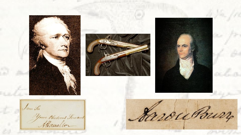 The Duel • Aaron Burr challenged Hamilton to a duel. • On July 11, 1804, the two men faced each other. Hamilton, who despised dueling, fired into the air. He was killed by Burr. What rules were there in a duel?