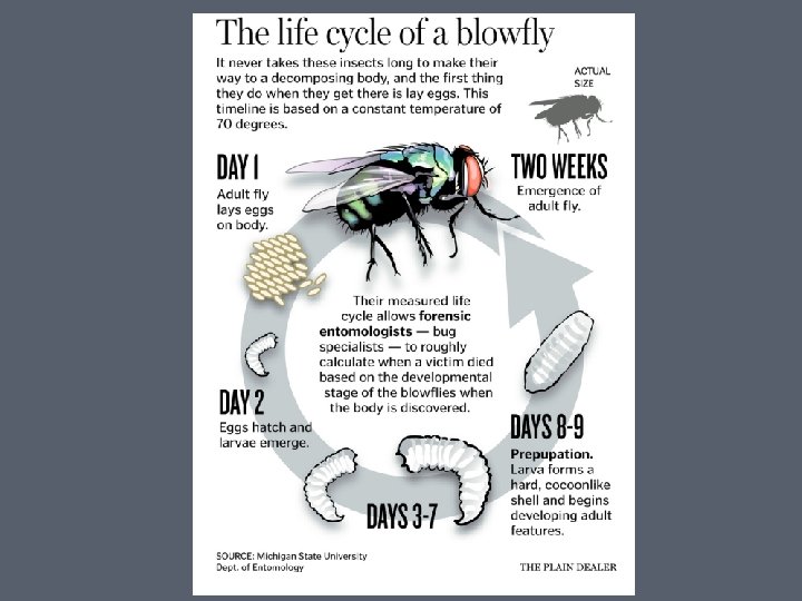 Other uses of insects • Presence of wounds – if maggots found on torso rather than in mouth, nose etc. • Place suspect at crime scene – e. g. if murder suspect had chigger bites and chiggers found to only be in that one area • Contraband trafficking may contain insects - can determine where it came from • Insects on front of a car may indicate where a person has been • Presence of drugs in a body may be detected by presence of drugs in maggots
