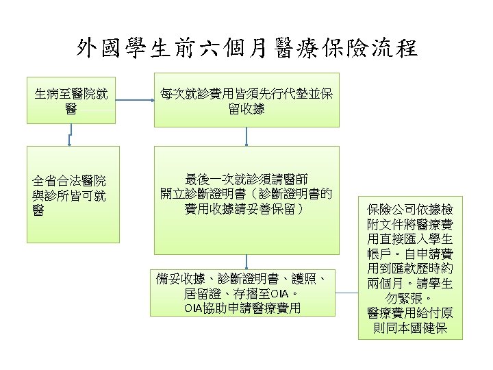 The Process (of First Six Months) of Applying for Medical Insurance for International Students Go to the hospitals You have to pay for the doctor’s fee and keep the receipt. You can go to all legal hospitals and clinics in Taiwan. Some designate hospitals in Hualien: Hua-lien Hospital Remember to issue the certificate of diagnosis when it is the last appointment of the same doctor. (Please keep the receipt for the fee to apply for certificate of diagnosis) Buddhist Tzu Chi General Hospital Gather the receipt, certificate of diagnosis, copy of your passport, ARC and bank statement to OIA will help you apply for the refund of medical expense. After the insurance company checks all the documents, the refund of medical expense will remit to the student’s account. It will take two months during the procedure, so please do not worry. The principle of refunding medical expense is according to the law of National Health Insurance.