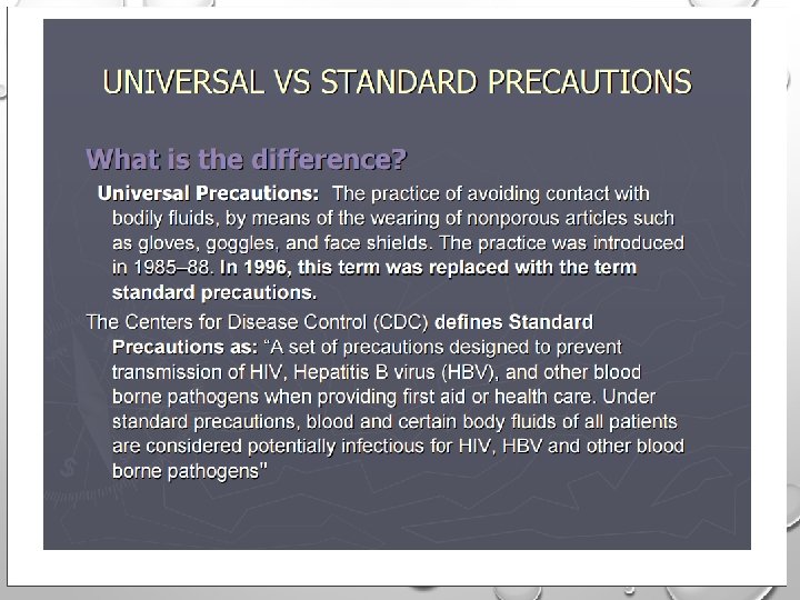DISEASE TRANSMISSION • CONSIDER EACH PATIENT POTENTIALLY INFECTIOUS FOR AIDS, HEPATITIS B AND C, OTHER BLOODBORNE PATHOGENS • APPLY TECHNIQUES OF STANDARD PRECAUTIONS