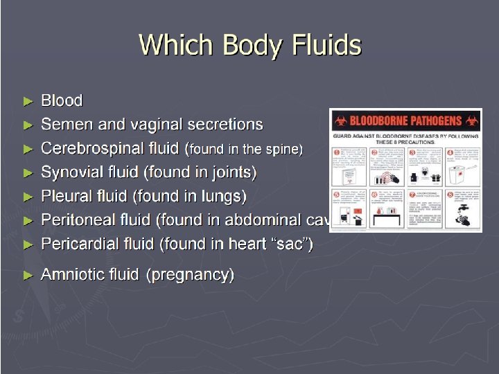OSHA REGULATIONS • THE BLOODBORNE PATHOGEN STANDARD • METHODS OF COMPLIANCE TO PREVENT EXPOSURE • UNIVERSAL PRECAUTIONS • ENGINEERING AND WORK PRACTICE CONTROLS • PERSONAL PROTECTIVE EQUIPMENT (PPE) • CLEANLINESS OF WORK AREAS • HEPATITIS B VACCINE • FOLLOW-UP AFTER EXPOSURE • MEDICAL RECORDS