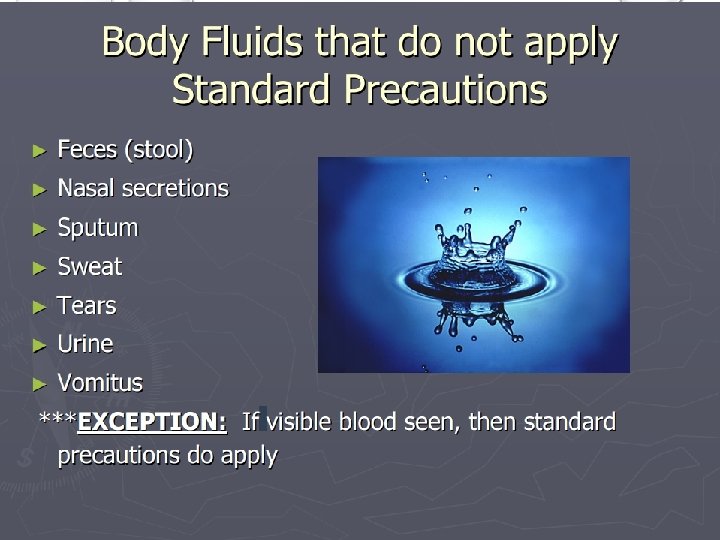 STANDARD PRECAUTIONS • BLOOD • ALL BODY FLUIDS, SECRETIONS, EXCRETIONS REGARDLESS OF WHETHER THEY CONTAIN VISIBLE BLOOD • NONINTACT SKIN • MUCOUS MEMBRANES PERSONAL PROTECTIVE EQUIPMENT (PPE) >>