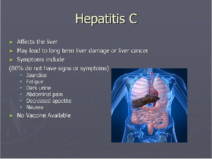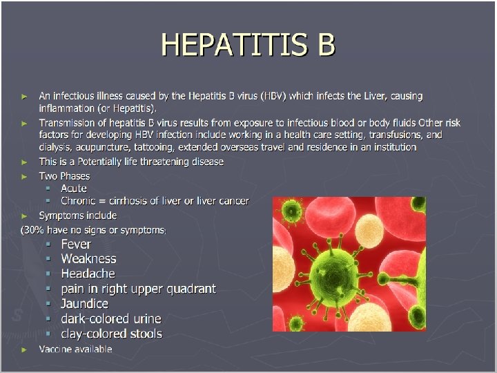 HIV AND HEPATITIS B AND C • ACUTE VIRAL HEPATITIS DISEASES • LIVER INFLAMED; HEPATIC CELLS DESTROYED • SEVERAL TYPES OF VIRAL HEPATITIS • RISK FOR CONTRACTING HBV AND HCV GREATER THAN FOR CONTRACTING HIV • NO VACCINE TO PREVENT HCV • NO TREATMENT AFTER EXPOSURE TO PREVENT INFECTION • MEDICATION: IMMUNOMODULATORS